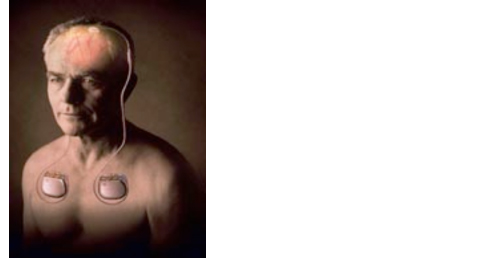 L’intervento dura dalle 5 alle 8 ore e avviene con il paziente sveglio. Questa circostanza, accettabile in quanto l’intervento non è doloroso, è resa necessaria dal fatto che durante l’intervento viene controllata la corretta collocazione degli elettrodi verificando al momento l’efficacia della stimolazione sulla rigidità muscolare e l’assenza di effetti collaterali. Una volta collocati a livello dei Nuclei Subtalamici, gli elettrodi vengono collegati ad una batteria, posta sotto la cute dell’area sottoclavicolare (Figura 7).