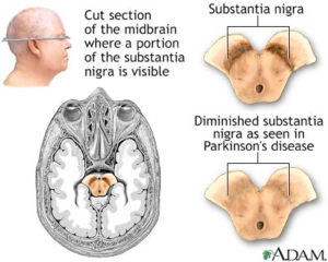 Alla base della Malattia di Parkinson è stata identificata una riduzione del numero e dell’attività dei neuroni dopaminergici a livello della Substantia Nigra (Figura 3). Questo nucleo produce dopamina, un neurotrasmettitore che ha il compito di trasmettere le informazioni agli altri Nuclei della Base e alle altre strutture cerebrali. La riduzione della dopamina nel circuito porta al relativo eccesso di un altro neurotrasmettitore: l’acetilcolina.